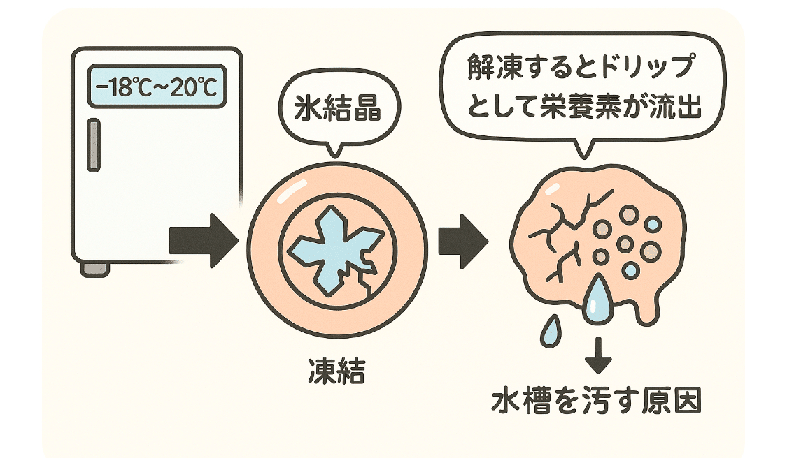 この温度帯で生餌を凍結すると、細胞内に含まれる水分がゆっくりと凍り膨張、大きな氷の結晶となって細胞膜を壊してしまいます。